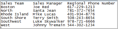- Info Fields that you want to add to the model appear in additional columns from left to right. For example, Sales Manager and Regional Phone Number.
