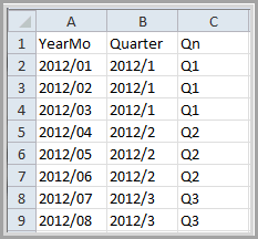 YearMo is the dimension column and Quarter and Qn are the Info Field columns. If you dive on YearMo in a Diver client, the values for Quarter appear in the console, even though this Info Field is not included in the model.
