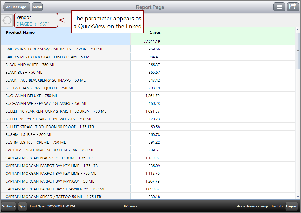 Notice the QuickView for Vendor with the DIAGEO value selected. The QuickView can change the dimension value without returning to the previous page. Also notice that the Cases total for the report page matches DIAGEO's total from the ad hoc page.