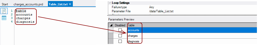 When using a file loop pattern, parameters are not available for editing as they are limited only to the values shown in the preceding table. For this example, three files in the /data/transactions folder is a parameter in the loop. The accounts_final.txt file is not a parameter as it is not a .csv file.
