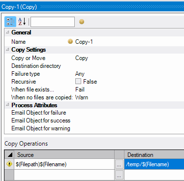 In the following example, the contents of the /data/transactions folder are copied to the /temp folder using a file loop pattern to get the file paths for each source file. A wildcard character (*) is used to signify that all csv files are to be looped through.