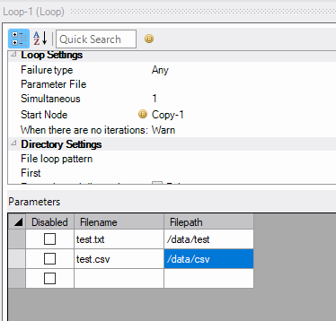 For each row in the parameter table the loop uses the values for each column wherever you choose to enter the parameter . For this example, the Filepath and Filename parameters are used to construct source and destination files for a Copy Process Node.