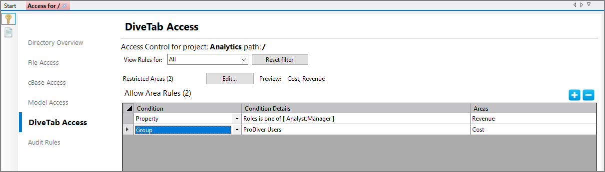 In the Allow Area Rules table, set rules to allow some users or groups access to those restricted areas.