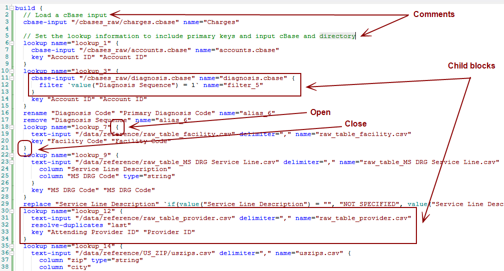 - Tags and elements are organized into blocks of code using braces ({ }).
