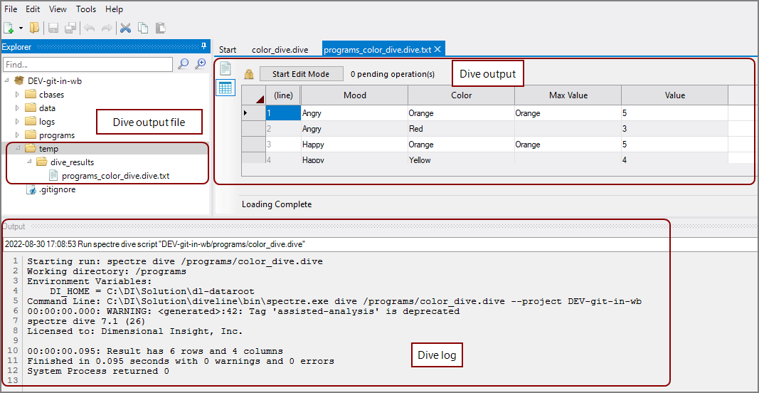 On the toolbar, click the green arrow to run the Dive script.