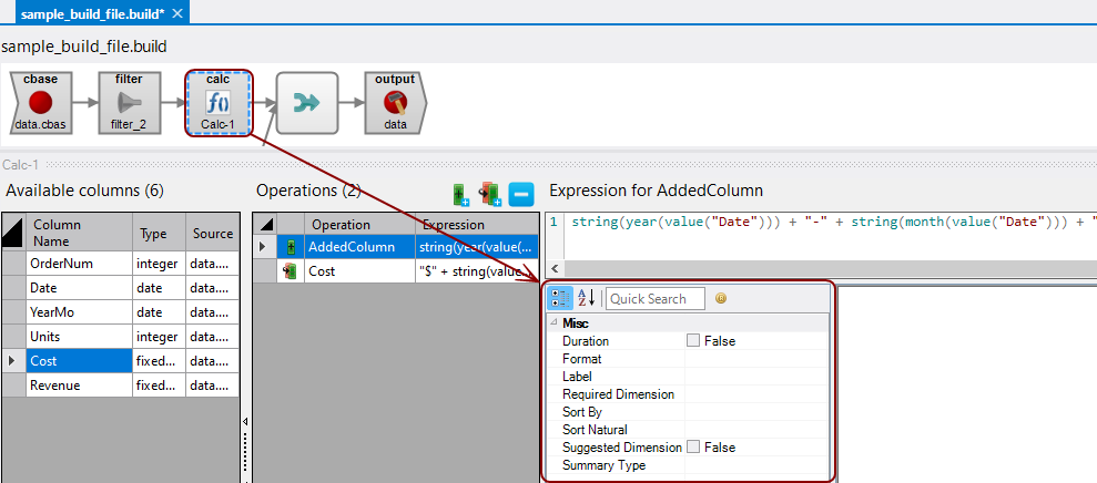 Note that each input flows into a Concat object, representing the main flow into the builder. Additional objects such as calcs, sorts, lookups and joins are added to the right of the Concat object.
