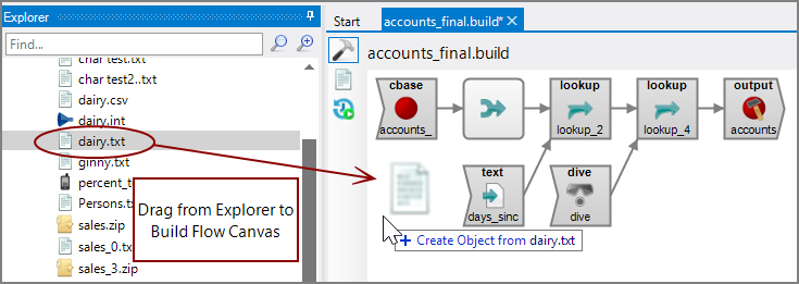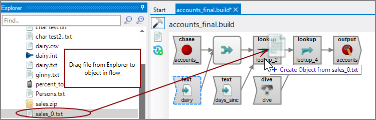 You can drag an appropriate file from the Explorer pane onto the build flow canvas. It becomes an input to the Concat object.