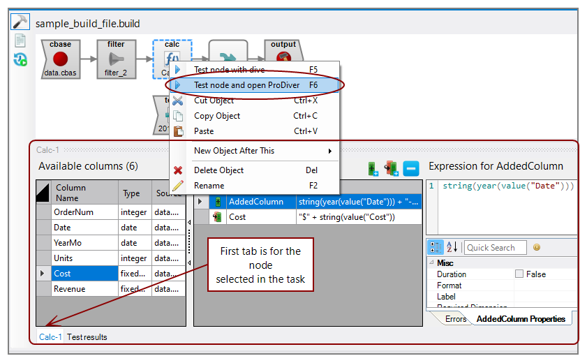 To test a node, select it on the flow canvas, right-click and select Test node and open ProDiver.